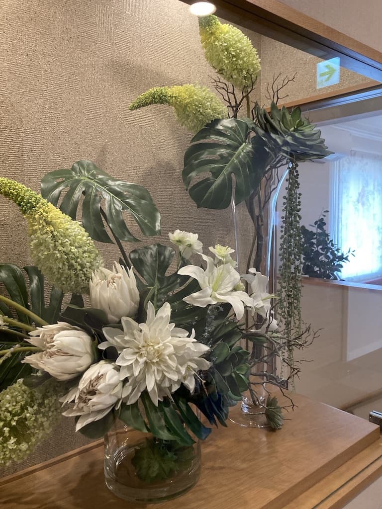 フェイクフラワーは枯れることなく虫も寄り付きません、こちらも病院や飲食店ほかオフィスの受付、商業施設で好まれています。レンタルはこちらまで